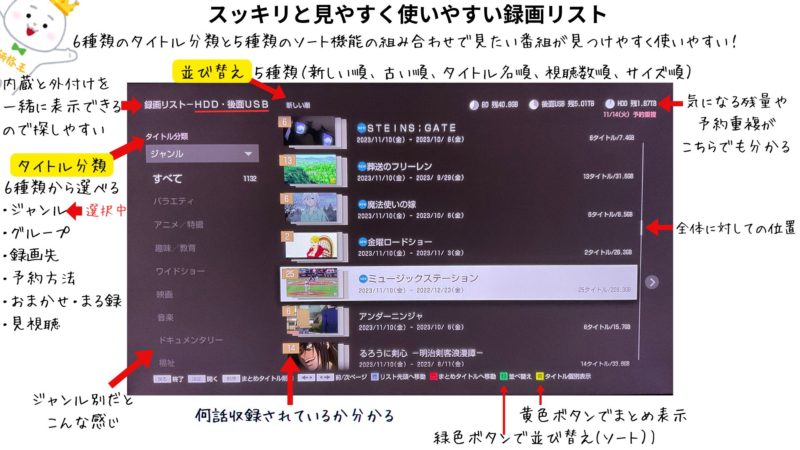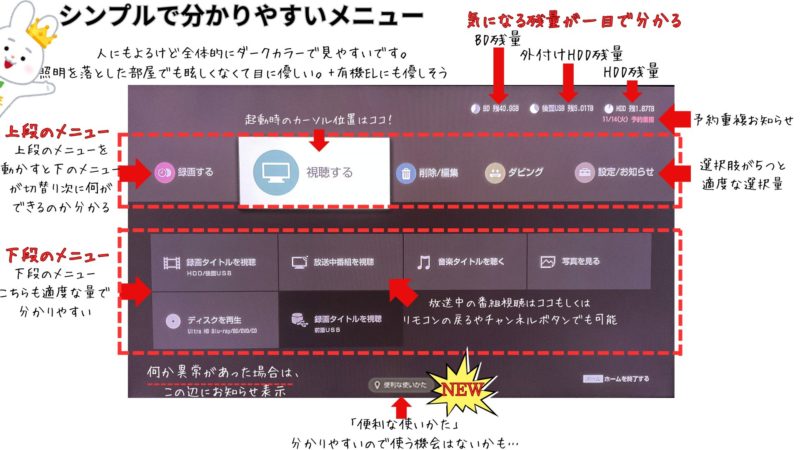 優れた使い心地:ホームメニューだけでなく番組表、録画リスト、設定変更、字幕のON/OFFなどあらゆるところが使いやすいです。