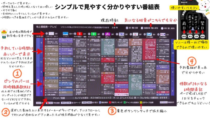 ① 使い勝手の良さ:他メーカーでも多少不便があっても普通に使えますが、やっぱりソニーが便利で使いやすいと実感します。(番組表、録画予約、編集、リモコン、操作性など全体的にセンスが良く使いやすいです。(早見再生とアプリの接続性以外はよくできています)