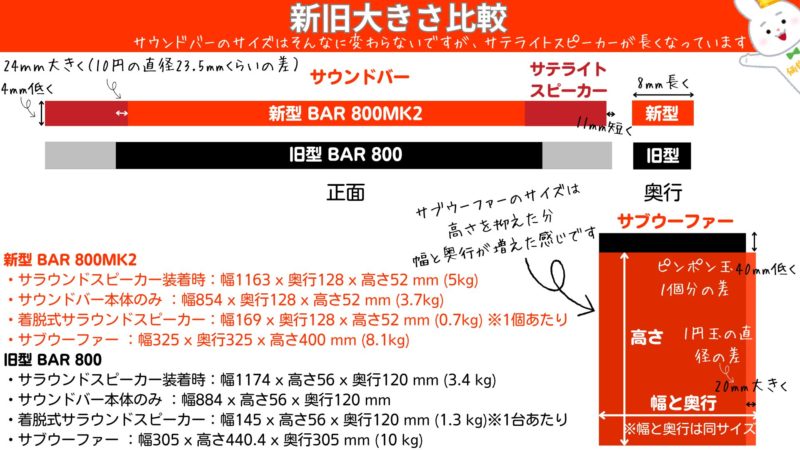 ・サブウーファー :幅315 x 高さ277 x 奥行275mm (12kg) ◀上位モデルの方が小さい