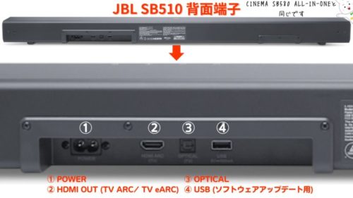 JBL SB510 :HDMI 1 ( ARC対応)、光デジタル入力 x 1、USB (サービス専用(5V DC、0.5A))