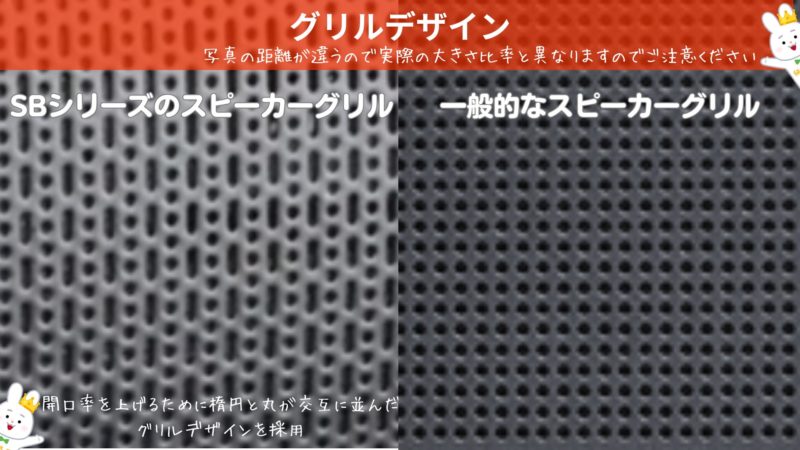 - 楕円と丸が交互に並んだグリルデザインを採用することで開口率を上げ、音の透過性の向上と中高音域の明瞭度の向上を図っています。