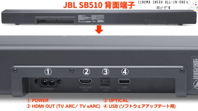 JBL SB510 :HDMI 1 ( ARC対応)、光デジタル入力 x 1、USB (サービス専用(5V DC、0.5A))